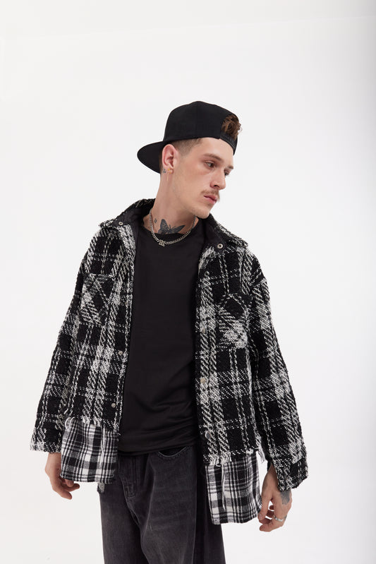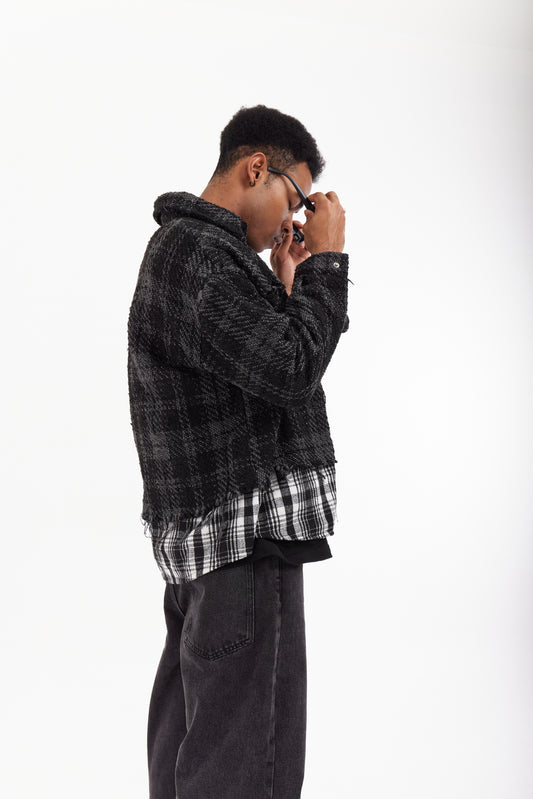 เสื้อยืดลายสก็อตสองชั้นสีเข้ม
